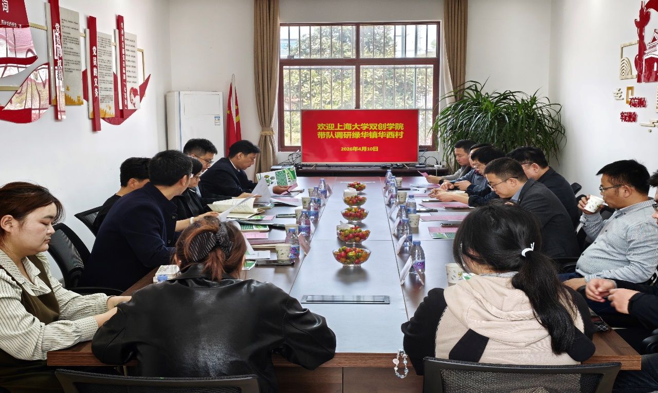 沪校联袂乡村行,双创赋能谋振兴 —上海大学创新创业学院赴崇明绿华镇华西村开展产学研深度合作 为深入贯彻落实国家乡村振兴战略,推动校地城乡党组织结对帮扶工作走深走实,4月10日,上海大学创新创业学院组织跨学科专家团队赴崇明区绿华镇华西村开展专题调研,围绕科技助农、乡村文旅等核心议题展开深度交流,并达成多项合作意向。上海大学创新创业学院执行院长朱频频、上海美术学院党委副书记、纪委书记宋国栓、环化学院教授胡雪峰、材料学院上善院副院长刘腾轼、上海美术学院教师葛天卿、材料学院教师徐京和创新创业学院主管李志峰等师生代表参加,崇明区绿华镇党委书记杨丽华、绿华镇党委副书记顾惠民等出席,共绘乡村振兴新图景。 溯源生态脉络,厚植发展根基 调研首站,团队走进绿华镇世界河口沙洲水文化展示馆。在绿华镇党委书记杨丽华介绍下,师生了解了崇明岛“江海交汇”生态特征与水文化脉络。绿华镇秉持“生态优先、绿色发展”理念,全力打造“长江口生态明珠”。同时,积极布局低空经济,探索“生态+低空”新模式,未来也希望与上海大学在多领域深化合作,共同探索“绿水青山就是金山银山”的实践路径。